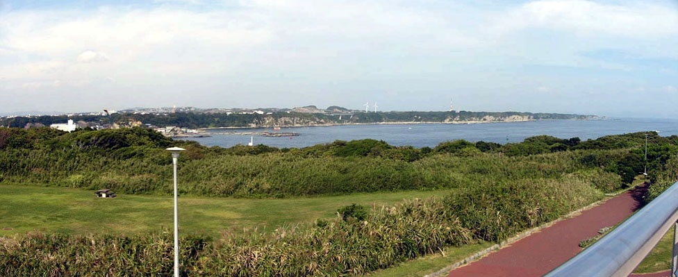 | 2009/9/28(13:49) 「城ヶ島公園」中ほどにある「第一展望台」から見る、北~北東方向の景色。 写真ほぼ中央に「宮川大橋」と「宮川公園」の風車が写る |