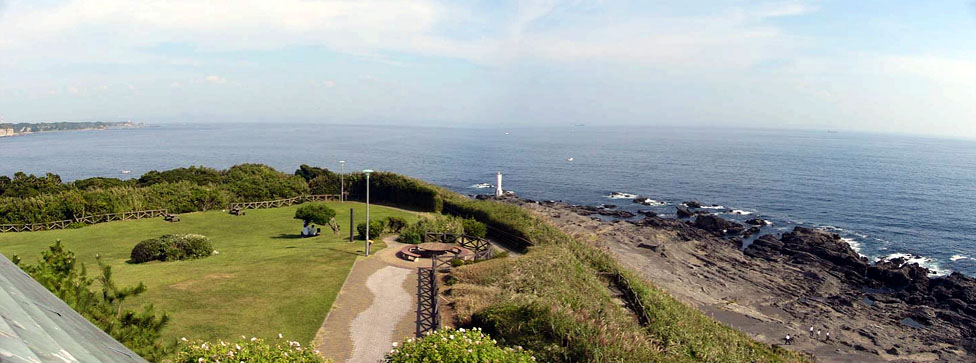 | 2009/9/28(13:56) 「城ヶ島公園」東側先端にある「第二展望台」から見る、東側の景色。 写真ほぼ中央に「安房崎灯台」が写る |
