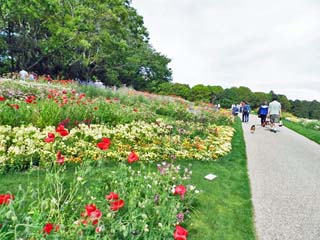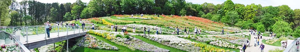 「花の見晴らしデッキ」から見る「大花壇」。 「大花壇」に咲く花の約8割は、横浜市内で生産されたという。 |