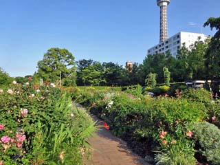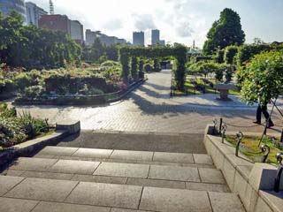 2022/6/12(16:52) 「沈床花壇」。 この場所は、山下公園が開園した当初「ボートベイシン(船溜まり)」であった。 昭和30年(1955)頃、埋め立てて「花壇」を作成。開園の頃に寄贈された「バラ」を植えたのが 「沈床花壇(バラ園)」の始まりという。 平成28年(2016)には、当時から受け継がれた株を継承すると共に、新たに宿根草を植栽する等、 四季折々の花が咲くバラ園として再整備された。 |
