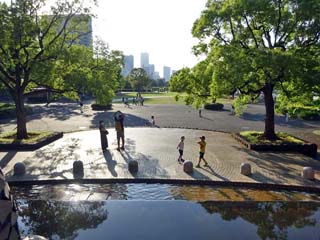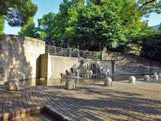 2022/6/12(17:06,17:07) 「水の階段」。 左の写真、背中の方向に「おまつり広場」。 右の写真、奥に「世界の広場」がある。 左の写真をクリックすると近づいて撮る「水の階段」が表示(450x600)されます。 |