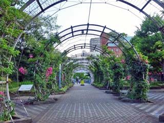 2022/6/12(17:13) 「世界の広場」から公園最南東端の 出入口(ポーリン橋)へと続くアーケード。 地下には、普通車222台、バス26台を収容する 駐車場があり、写真左方向には、駐車場出入口の エレベーターがある。 |