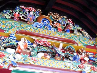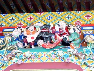 2010/4/14(10:59) 拝殿の向拝を飾る彫刻。 絢爛豪華。よく見るとユーモラスな感じで、頬が緩む。 |