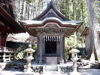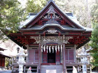 2010/4/14(11:01) 本殿(右の小さな建物)。 三峯神社は、日本武尊がこの国の平和と人々の 幸せを祈り、国生みの神、伊弉諾尊(いざなぎの みこと)・伊弉册尊(いざなみのみこと)を お祀りしたのが始まりとされる。 |