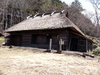 2010/4/14(11:41) 三峯神領民家。 神社を出て市営駐車場に向かうと、三峰ビジター センター(自然教室)がある。そのビジターセン ターの先に開ける傾斜地は、江戸時代、神社の神 領とされ、ここの住民は神社に年貢を納め、神社 の賦役に従事していたとのこと。 この建物は、実際に使われていた民家を、ここに 復元し保存している。 |