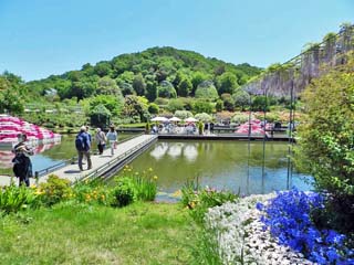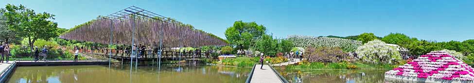 2019/5/8(11:12) 池の上の休憩所から見る景色。 写真左に、「大長藤」。中央右奥に、「白藤の滝」。右端に写るのは「水上花壇」。 |