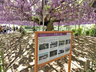2019/5/8(11:08) 「西ゲート」を入ったところで見る「大長藤」。 「大長藤」の見ごろには、花房が最長1.8mにも 成長するという。 写真をクリックすると「大長藤」の下で撮る 写真(600x450)が表示されます。 |