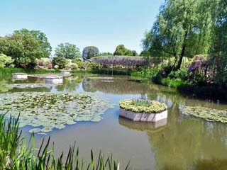 2019/5/8(11:11) 池の上に造られた「園路」。 写真右には、「大長藤」。 写真中央に写るパラソルは、 「池」の上の「休憩所」。 |