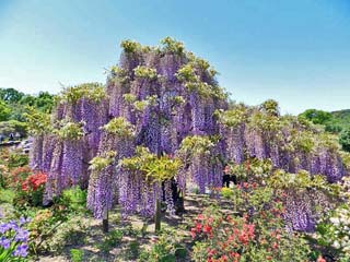 2019/5/8(11:34) 「大藤」。 樹齢150年を越える2本の古木で、 広さ1,000㎡の「大藤棚」を作る。 写真をクリックすると「大藤」の下で撮る 写真(600x450)が表示されます。 |
