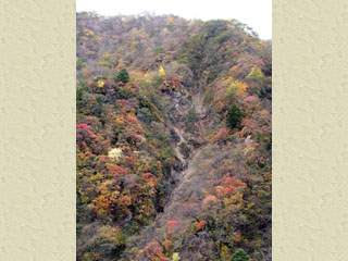 2010/10/26(14:40) 「湯川」左岸の遊歩道を上流に向け歩く。 なお、「竜頭」の名前は、「二枝に分かれた滝を 正面から見た姿を龍の頭に見立てたもの」で、 その姿は、下流側正面の観瀑台から眺めるのが よいといわれるが、その「観瀑台」を見落として しまったため、本ページでは、「湯川」左岸の 遊歩道からの写真を紹介する。 |