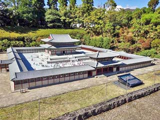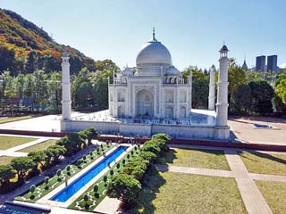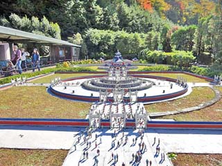 写真奥には、ヨーロッパゾーンの「エッフェル塔」や、アメリカゾーンの「高層ビル群」、 現代日本ゾーンの「東京スカイツリー」なども写る。 |