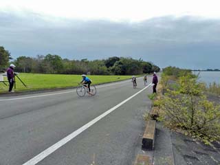 2016/10/30(8:58) 「デュアスロンキッズ」を先導するバイク。 「トライアスロン」の大会関係者の動きから、 何かあるのかと、しばらく見ていると、 「デュアスロンキッズ」の自転車集団がやってきた。 先頭を走る自転車は、独走態勢である。 「デュアスロン」は、「トライアスロン」の水泳を 中距離走に代えたもので、この日の小学生 中高学年の部では、第一ランが1km、 自転車が5km、第二ランが2kmであった。 |