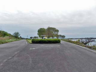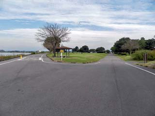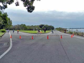 2016/10/30(8:59) 写真左の方向が「東谷中橋」、右が「中の島」。 「デュアスロンキッズ」の自転車は、右の道を こちらに向かって走り、このヘアピンカーブを 右折して、左の道へと走り抜けていく。 |