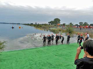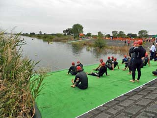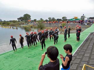 2016/10/30(9:33) 水泳のスタートを前にくつろぐ人達。 この日の「トライアスロン」は、2種目があり、 種目Aは、水泳0.6km、バイク30km、ラン5km。 種目Bは、水泳0.3km、バイク15km、 ラン2.5kmとなっていた。 |