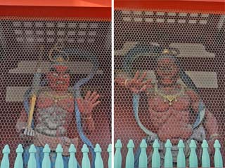 2016/4/15(16:48) 宝蔵門の「仁王像」。 左、「錦戸新観」作の阿形像。 右、「村岡久作」作の吽形像。 各々、総高5.45mで、重さ約1,000kgという。 「宝蔵門」は、「仁王像」を安置することから、 当初「仁王門」と呼ばれていたが、昭和39年(1964)、 現在の門に再建された際、浅草寺の宝物収蔵庫として、 近代的防災設備を備えたことなどから、「宝蔵門」と 呼ばれるようになったという。 写真をクリックすると拡大画像(600x450)が 表示されます。 |