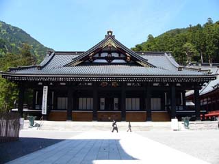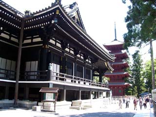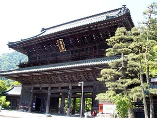 2010/5/28(13:43) 「三門」。 三門とは、「三解脱門」を意味し、空・無相・ 無願を経て、涅槃の境地に至る仏教の摂理を 表している。 間口23m、奥行き9m、高さ21mの総欅造り で、京都の知恩院、南禅寺の門と共に日本三大門 に数えられている。 ここが、登山道の始点(1丁目)である。 |