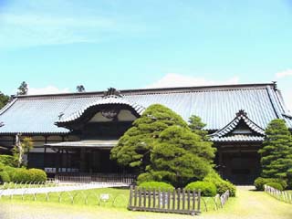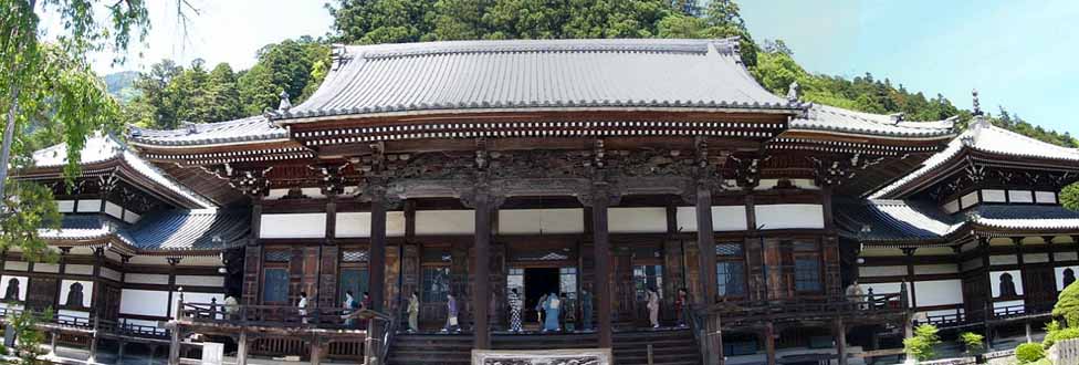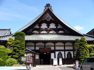 2010/5/28(13:27) 「仏殿・納牌堂(上右2枚と同じ建物を正面から撮影)」。「仏殿」の左右に「納牌堂」がある。 パノラマ写真合成上、魚眼レンズで撮影したようにゆがんでいるが、イメージはお分かりいただけるであろう。 |