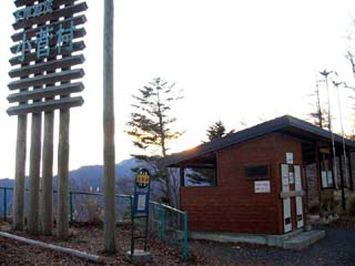 | 2009/12/17(16:27) 「松姫峠」にある「小菅村」の標識と 「トイレ」。 中ほどに見える「バス停」の後ろに 「雁腹摺山」がある。 |