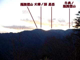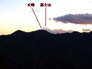 2009/12/17(16:30) 「松姫峠」から見る「富士山」方向の景色。 「富士山」は、ほぼ南南西の方向にあり、 「大峰」の後ろに隠れるように見える。 |