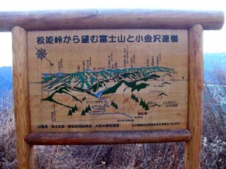 | 2009/12/17(16:29) 「松姫峠」にある「案内図」。 「案内図」には、南の「御正体山」から、 西北西の「大菩薩嶺」までの山々が 描かれている。 |