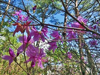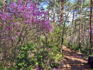 探索路に覆い被さるように咲く「ミツバツツジ」。