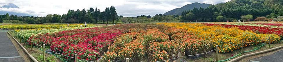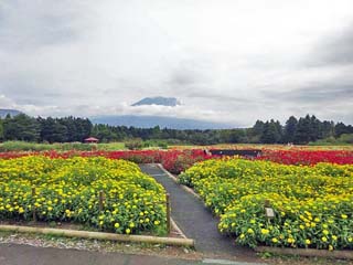 2023/10/3(13:05) 「虹の花まつり」会場。 写真左端に「富士山」。「ガーデンタワー(展望塔)」やショップ&ギャラリーは、写真の更に右方向にある。 写真左の道を右に入ったところに「虹色のサークルベンチ」があるのだが、想像より小さく「期待はずれ」。 このため、近くで撮る写真が残らない。 写真をクリックするとイングリッシュガーデンから撮る写真から「虹色のサークルベンチ」を切抜く画像が(600x450)表示されます。 |