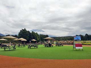 2023/10/3(13:32) 「ショップ&ギャラリー」前の広場。 「富士芝桜まつり」で並んでいた「キッチンカー」も この日はなく、テーブルは空いている。 |