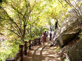 | 2009/11/4(13:25) 昇仙峡は、ガイド付きの「トテ馬車」に乗って、 見るのも「乙なもの」だが、「覚円峰」から 先「仙娥滝」までの間は、車も馬車も通らない 「遊歩道」となる。 |