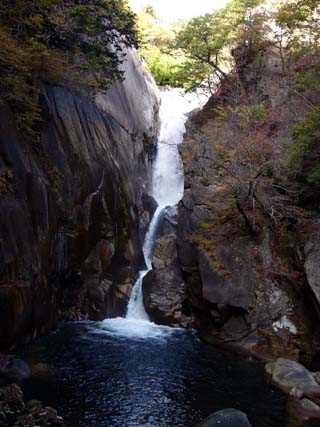 2009/11/4(13:38) 高さ30mの「仙娥滝(せんがたき)」。 この先、「昇仙峡ロープウェイ」「荒川ダム」、 「大滝」と見るところはあるが、この日は、 ここでUターン「長潭橋」まで、歩いて戻る。 |