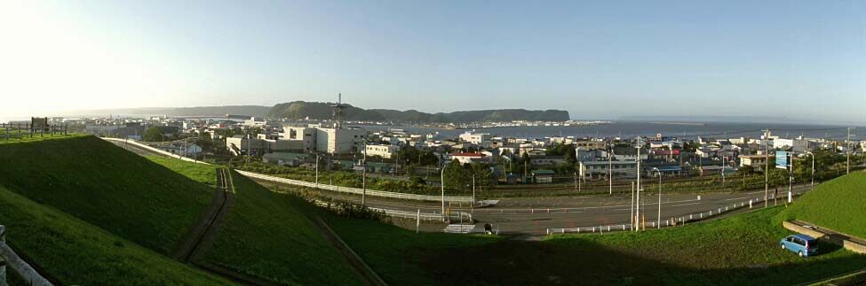 中央、海の向こう側に「厚岸漁港」。手前は、「厚岸町役場」を中心とする町並み。