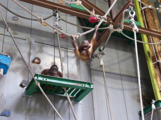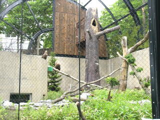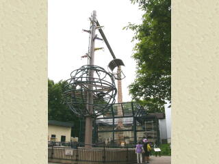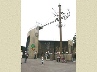 2010/7/2(11:18) 「オランウータン館」。 ここでは、飼育舎と運動場にある高さ17mの 塔を渡るオランウータンの様子が観察できる。 |