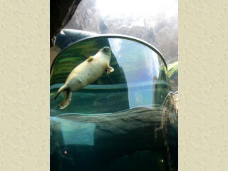 2010/7/2(12:08) 「マリンウェイ(円柱水槽)」を泳ぐ 「アザラシ」。 好奇心の強い「アザラシ」は、この円柱の中を、 何度か往復してくれるのだが、周りの人だかり で、なかなかいい写真が撮れない。 |