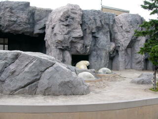 2010/7/2(12:26) 放飼場の「ホッキョクグマ」。 半円球の蓋のようなものは、「シールズアイ (カプセル)」で、この中から「アザラシ」の 視点から見る「ホッキョクグマ」を観察する ことができる。 |