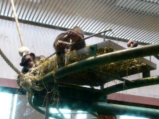 2010/7/2(11:18) 「てながざる館」。 「シロテナガザル」が、高さ14mの鉄塔を 「ブラキエーション(腕でぶら下がりながら 体を振り腕渡りすること)」をしながら渡る 様子や、ロープや鉄棒を使ってのすばやい動きを 見ることができる。 |