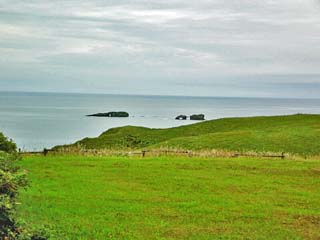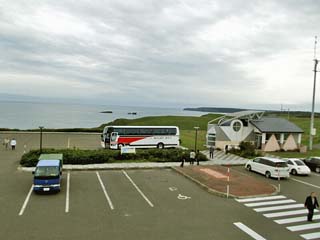 2011/9/11(14:06) 「琵琶瀬展望台」から見る「太平洋」側 (南)の景色。 観光バスの奥には、奇岩「窓岩」も見えている。
