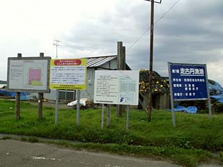 「走古丹漁港」入口に並ぶ案内板。