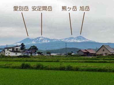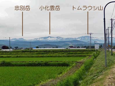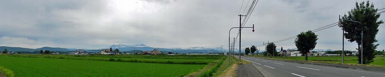 2013/6/17(6:54) 道の駅ひがしかわ「道草館」付近で見る「大雪山系」の山々。 撮影場所は、道の駅ひがしかわ「道草館」から道道1160号「旭川旭岳温泉線」を大雪山(東)に向け1.4km程走った所である。 進行方向左前方に「大雪山」。ほぼ正面に「トムラウシ山」。右前方には「十勝岳連峰」が見える。 注:写真は、横が1,280ピクセルあります。写真直下にあるスクロールバーをご利用ください。 |