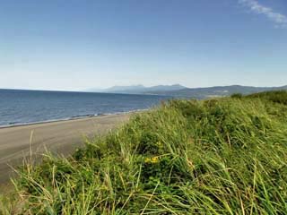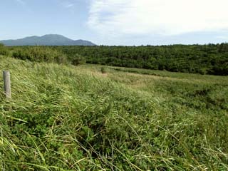 2011/9/8(13:35,13:35) 海岸に近い土手のようになった高台からみる景色。 左の写真:奥に見えるのは「知床連山」。 右の写真:左奥は、「海別岳:標高1,419m」。 2枚の写真からは、海岸の砂丘から草原へ、そして草原から林へと変わっていく様子が見て取れる。 |