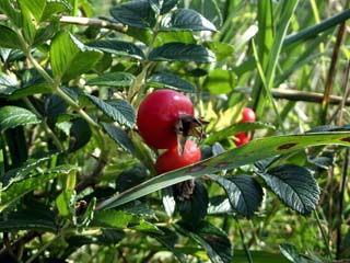 2011/9/8(13:45,13:48) 「ハマナス」の実(左)と花(右)。 花期は6~8月と聞くが、まだ一部に花を見ることができた。 |