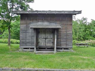 2013/6/17(15:20) 「旧河西家米倉」。 建築年代:明治30年頃、旧所在地:札幌市厚別区。 厚別地区での米作は、明治16年(1883)長野県からの 移住者により始められ、明治20年代になり本格的に 耕作されるようになったという。 |