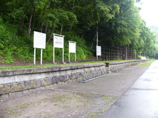 2010/7/3(6:46) 「旧神居古潭駅」下り線ホーム。 「線路」、「枕木」等は外されているが、 「駅名標」、「名所案内」などは、当時のもの が、そのまま残されているようだ。 |