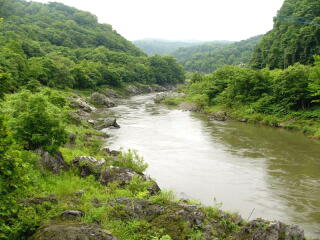 2010/7/3(6:59) 「神居大橋」から見る下流側の景色。 「神居古潭」の周辺は、石狩川両岸が美しい 景勝地であるとともに、稀な景観でもあること から、「旭川八景」の一つに選ばれている。 1.5km程下った左側(左岸)には、「竪穴 住居遺跡」があり、約3.5haの面積の中に、 奈良時代末期から平安時代に使われていたと 思われる、竪穴二百数十基とチャシコツ(砦跡) 1ヶ所が残されている。 |
