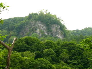 2010/7/3(7:03) 「神居岩」。 アイヌ語で「クッ・ネ・シリ(岩崖になっている 山)」。アイヌの守護神「サマイクル」が、獣皮 を乾かしたところといわれている。 ハイキングコースもあり、この撮影場所から 30分程度で、崖の上まで登れるそうである。 |