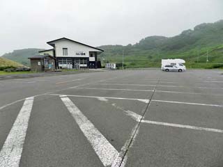 2013/6/19(8:41,8:42) 「神威岬」駐車場。 「神威岬(かむいみさき)」は、北海道積丹半島の北西部にある日本海に突き出した岬であり、 岬の付け根にある駐車場から突端に至る遊歩道「チャレンカの道」は、その形から「恐竜の背中の上を 歩く道」として知られる。 また、積丹半島を代表する観光地であることから、ここを「積丹岬」と勘違いする人も多いようだが、 「積丹岬」は、「神威岬」から東北東に11km強離れた「積丹半島」の最北端にある。 左の写真は、駐車場から岬突端方向を撮る。建物はトイレである。 右の写真に写る建物は、レストハウス「カムイ番屋(ペニンシュラ)」。 |