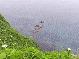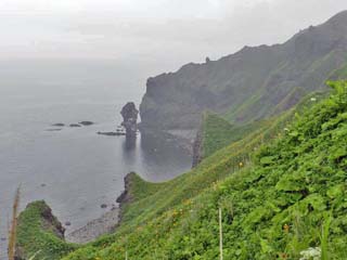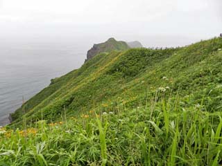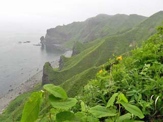 2013/6/19(8:50) 「女人禁制の門」手前の休憩広場から見る岬南側斜面。 斜面には、「エゾカンゾウ」が群生する。 |