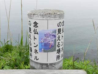 2013/6/19(8:58,8:58) 「念仏トンネル」の見える場所。 「念仏トンネル」は、波打ち際を歩く危険を避けるために造られた全長60mのトンネルで、 当時、灯台に行く唯一の道であったが、灯台は無人化され、遊歩道も完備された現在、 このトンネルは、「立入禁止」になっている。 左の写真をクリックすると「念仏トンネルの由来」が表示(800x600)されます。 右の写真をクリックすると6.5倍ズームで撮る「念仏トンネル」が表示(600x450)されます。 |