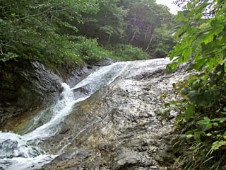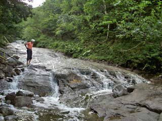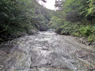 2011/9/9(7:46) 下から上流方向を見る。 流れは緩やかで、スニーカーでは靴の中に水が 入ってしまうが、登山靴なら水はほとんど 入らないという感じである。 また、この川は、強酸性のため、水の流れている 所には苔が生えない。そのため、水が流れている 所を歩いた方が滑りにくいという。 |