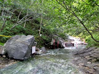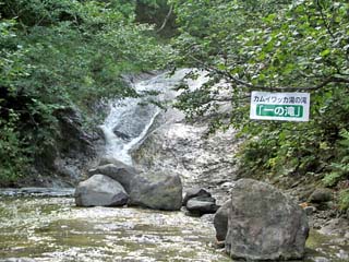 2011/9/9(7:47) 「一の滝」。 温泉として浸かれる一番下の滝は「四の滝」だと いう。以前は「四の滝」まで登ることができたの だが、観光客の激増により、転落/落石の危険 から、現在は、「一の滝」から上は立入禁止と なっている。 このため、「一の滝」に浸かる人もいるという が、冷たくはないものの、暖かさにはほど遠い。 温水プール(30℃前後)といったところで あろう。 なお、シーズン中は、バス停前に簡易トイレと 更衣室が設置されるというが、この時期では トイレすらなかった。 |
