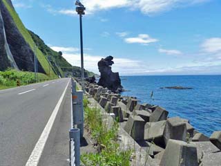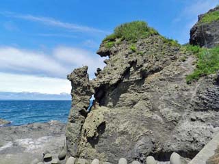海岸には、多くの奇岩が点在することから、通称「奇岩ロード」とも呼ばれている。 左の写真の岩は、「三味線岩」だと思うのだが「三味線」の形はしていない。また、信頼できそうなHPを見ても