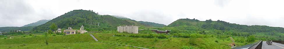 2013/6/22(7:33) 第2展望台から見る「桜ヶ丘団地」と「導流堤」。 「桜ヶ丘団地」の右に写る黒っぽい茶色の建造物が、 泥流を遊砂地に導くための「導流堤」である。 |